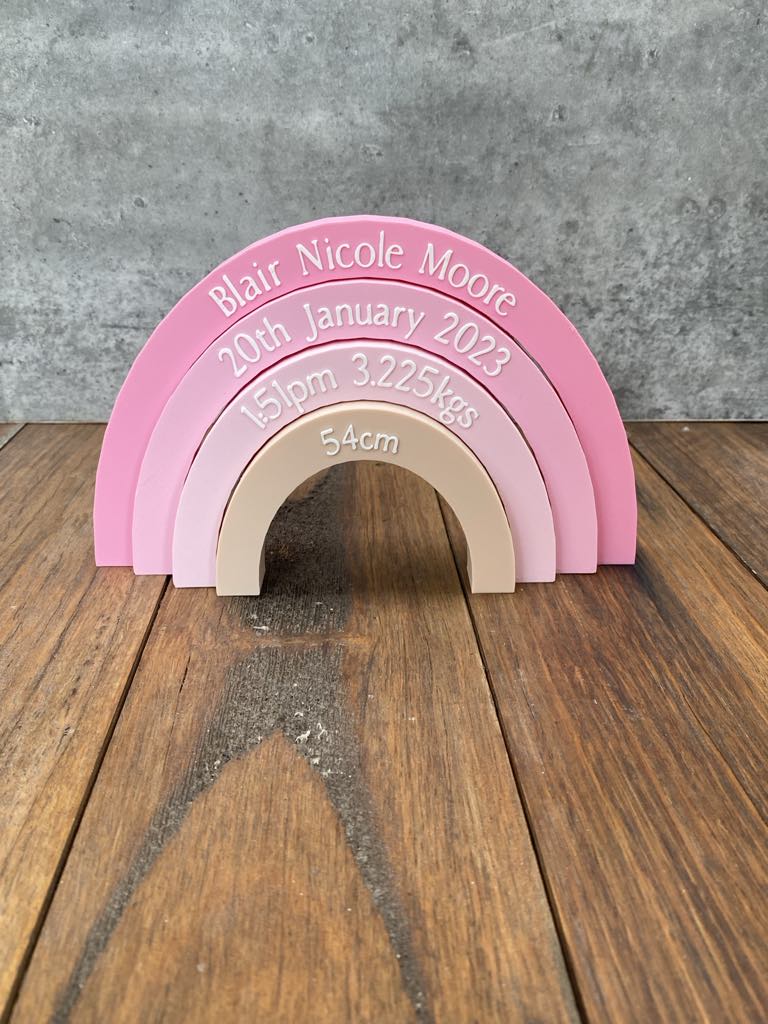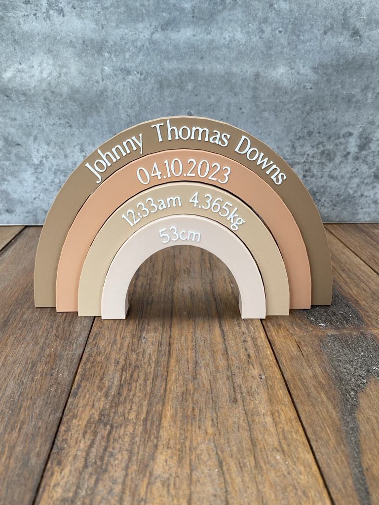 Our ‘3D Rainbow’ are the perfect addition to your little ones room. They are stackable and completely customisable! Mothers, fathers and parents can build your own rainbow. Choose between 3-4 arch, whichever colours you like, text or not text, text on one, two or all the arches; the choice is yours! Our 3D Rainbows are a completely unique personalised piece of nursery décor. They can be used to display your little ones birth details, just their name or have your whole family’s names on them. A lovely keepsake to enjoy for years to come.