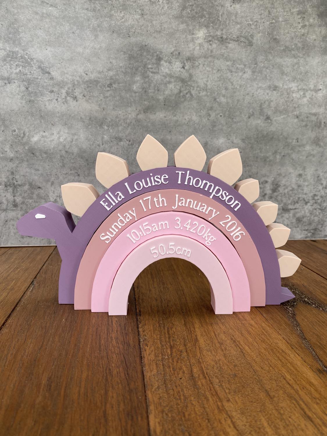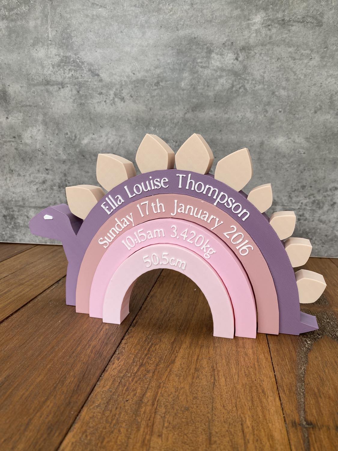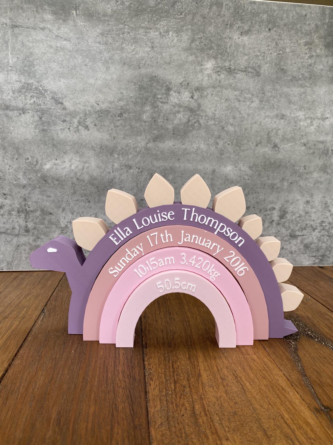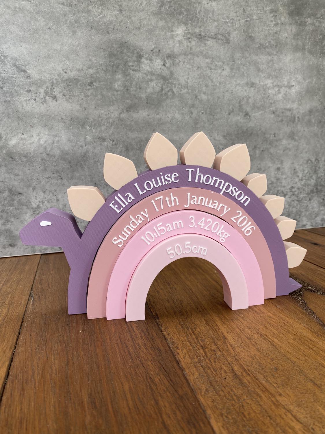 Our ‘Dino Stacker’ is the perfect addition to your little ones room. An adorable Stegosaurus. They are stackable and completely customisable! Mothers, fathers and parents can build your own Dino. Choose between 3-4 arch, whichever colours you like, text or not text, text on one, two or all the arches; the choice is yours! Our Dino Stacker are a completely unique personalised piece of nursery dĂ©cor. They can be used to display your little ones birth details, just their name or have your whole family’s names on them. A lovely keepsake to enjoy for years to come.