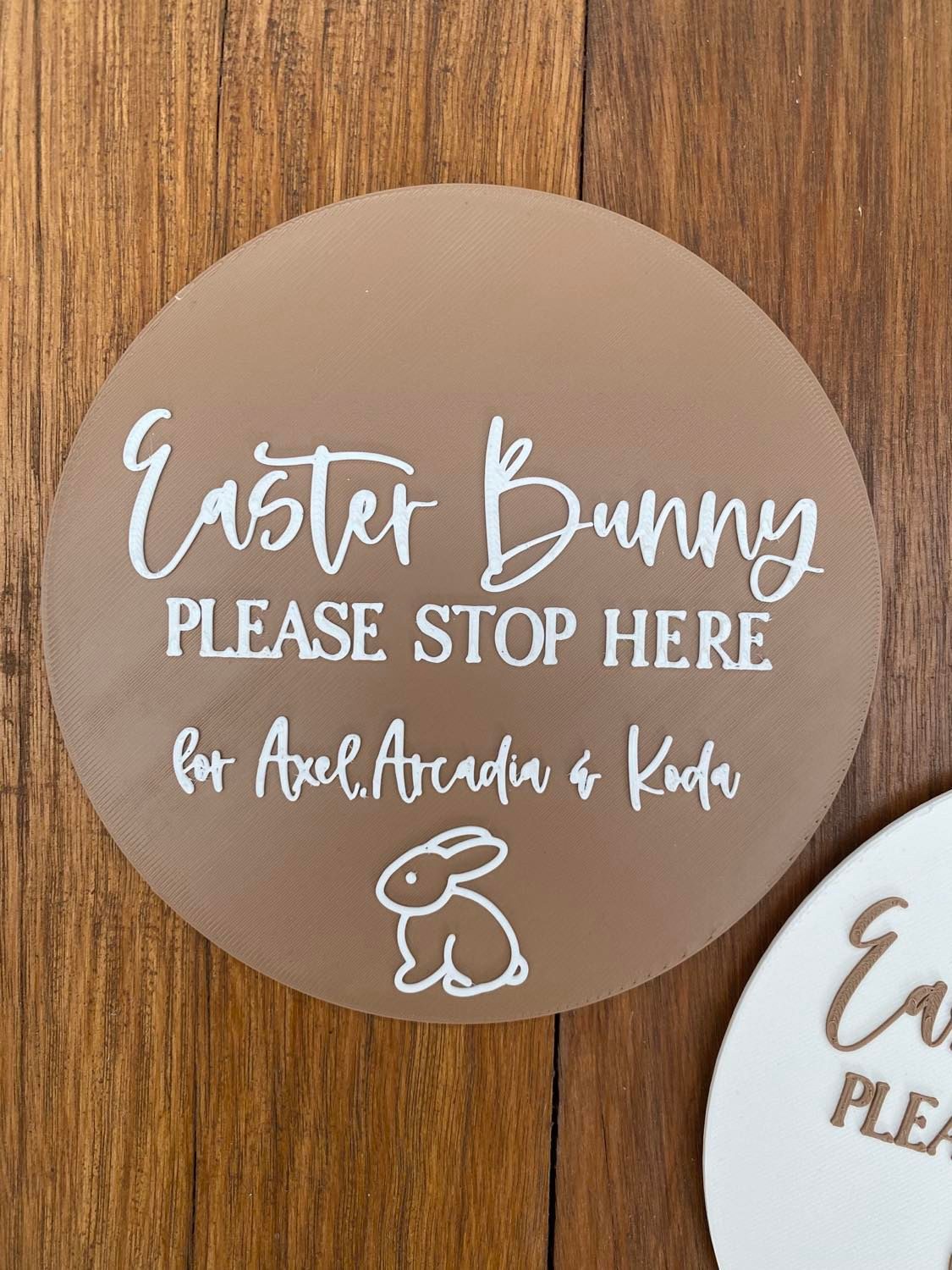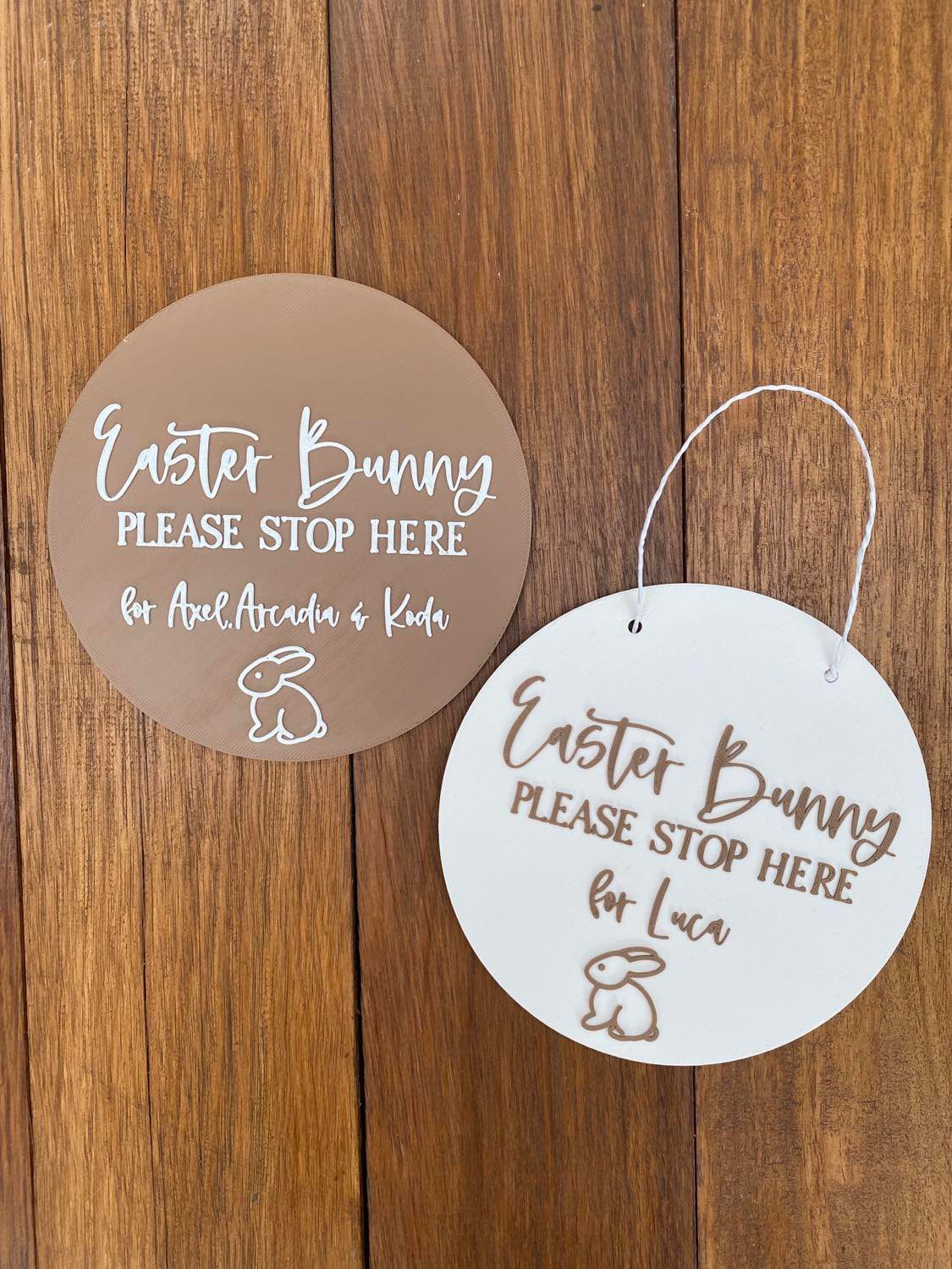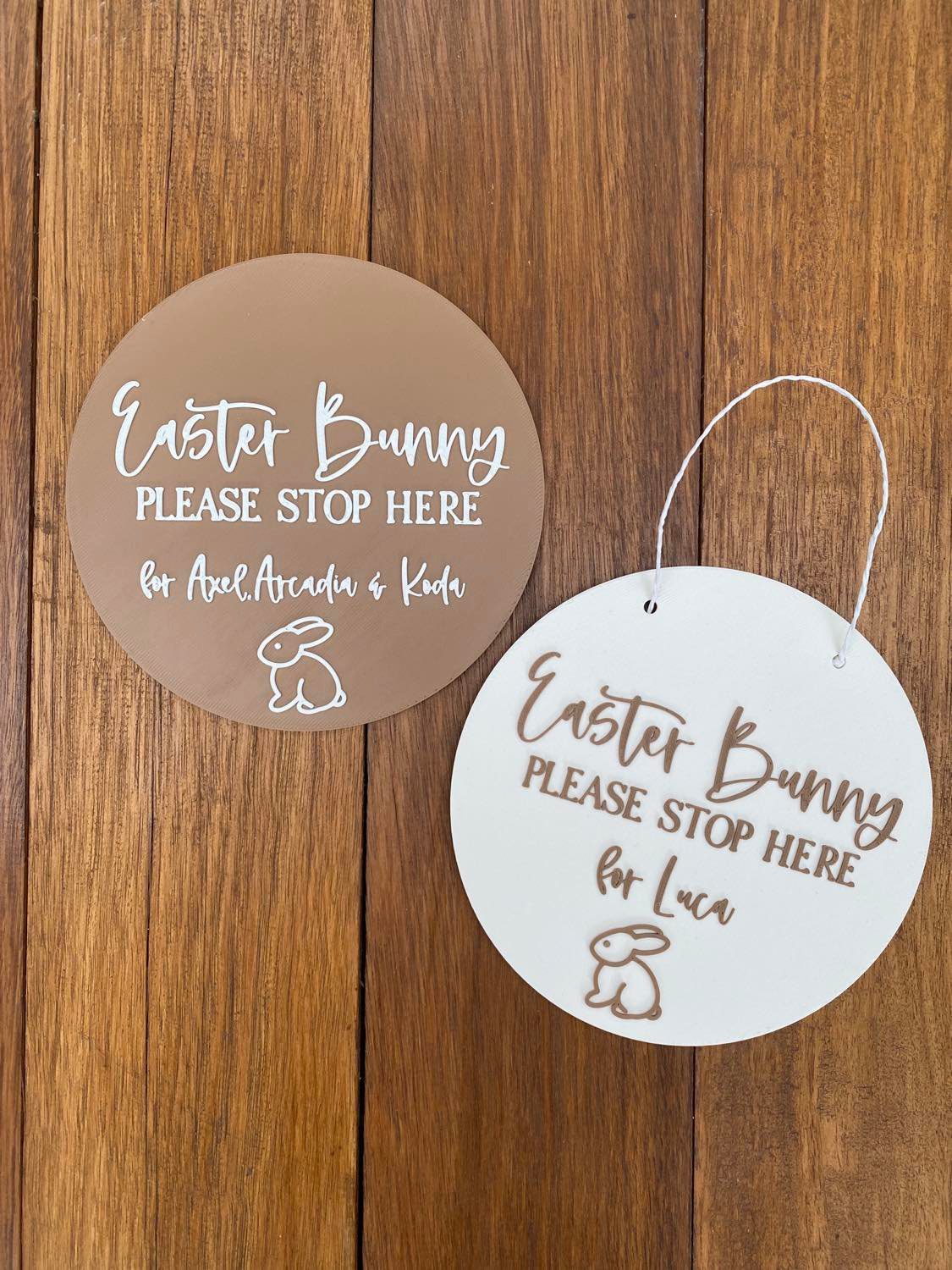 Our ‘Bunny Please Stop Here’ plaques are the perfect way to for your little ones to let the Easter Bunny know to visit! A great keepsake for mothers and fathers & addition to those Easter photos. Each plaque has the option of holes or no holes (string included) and is personalised with your children’s names. This plaque can be used as Easter dĂ©cor in your home giving the room a personalised touch.