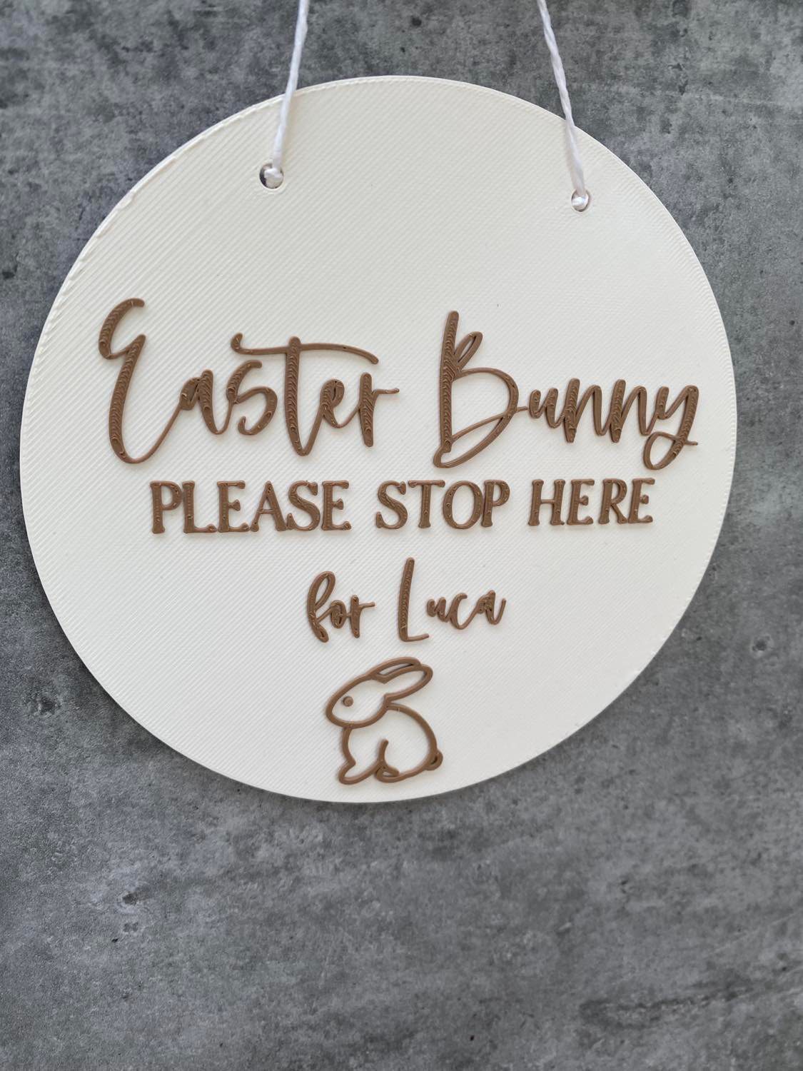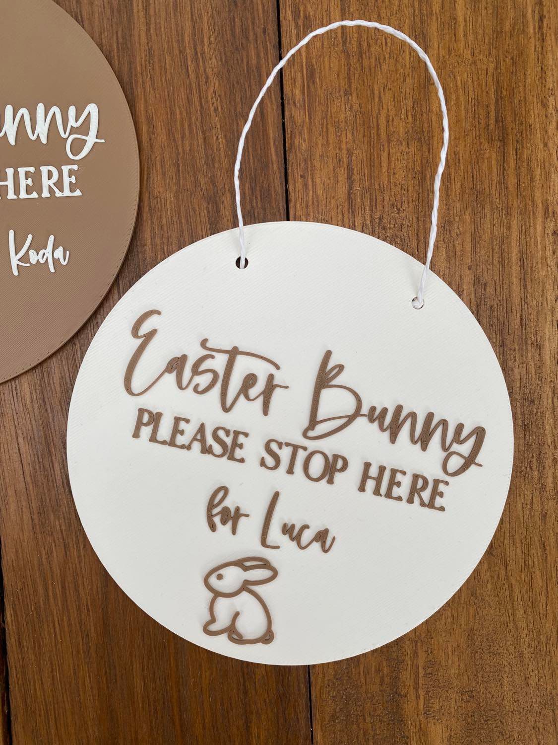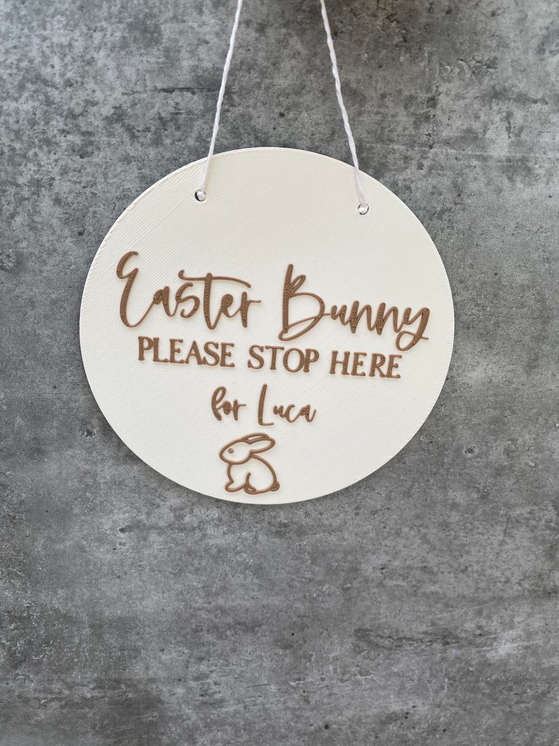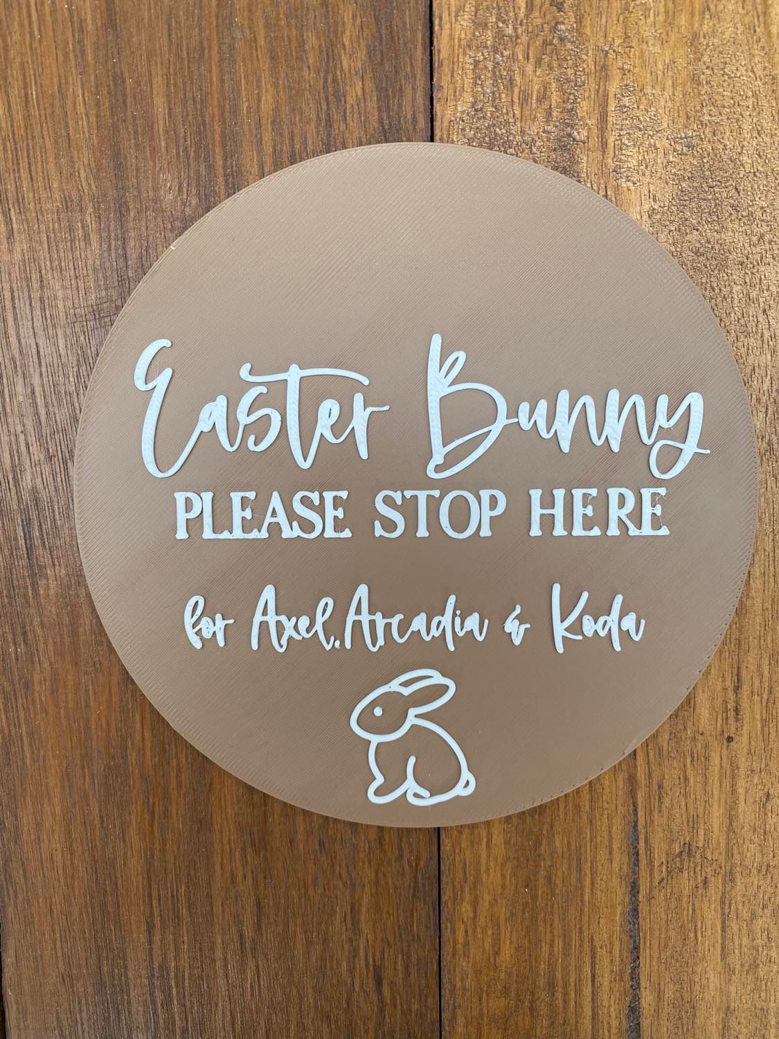 Our ‘Bunny Please Stop Here’ plaques are the perfect way to for your little ones to let the Easter Bunny know to visit! A great keepsake for mothers and fathers & addition to those Easter photos. Each plaque has the option of holes or no holes (string included) and is personalised with your children’s names. This plaque can be used as Easter dĂ©cor in your home giving the room a personalised touch.