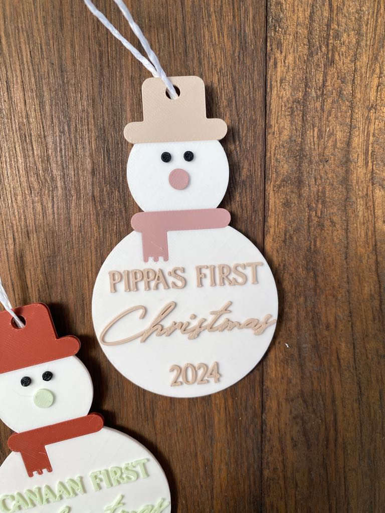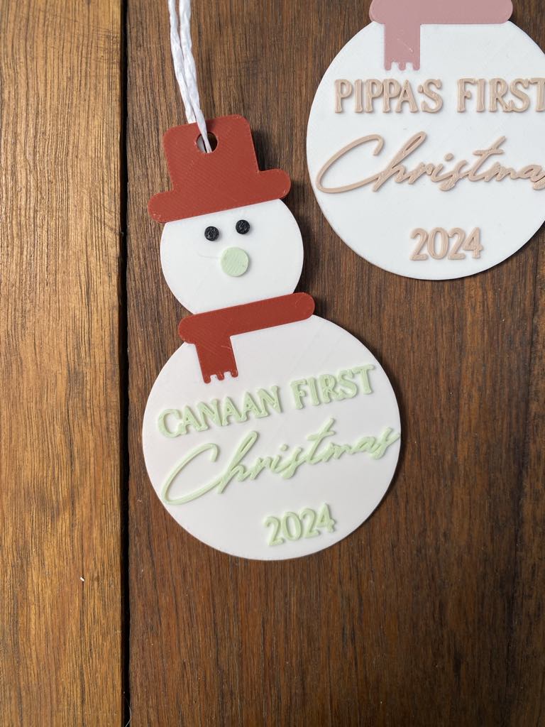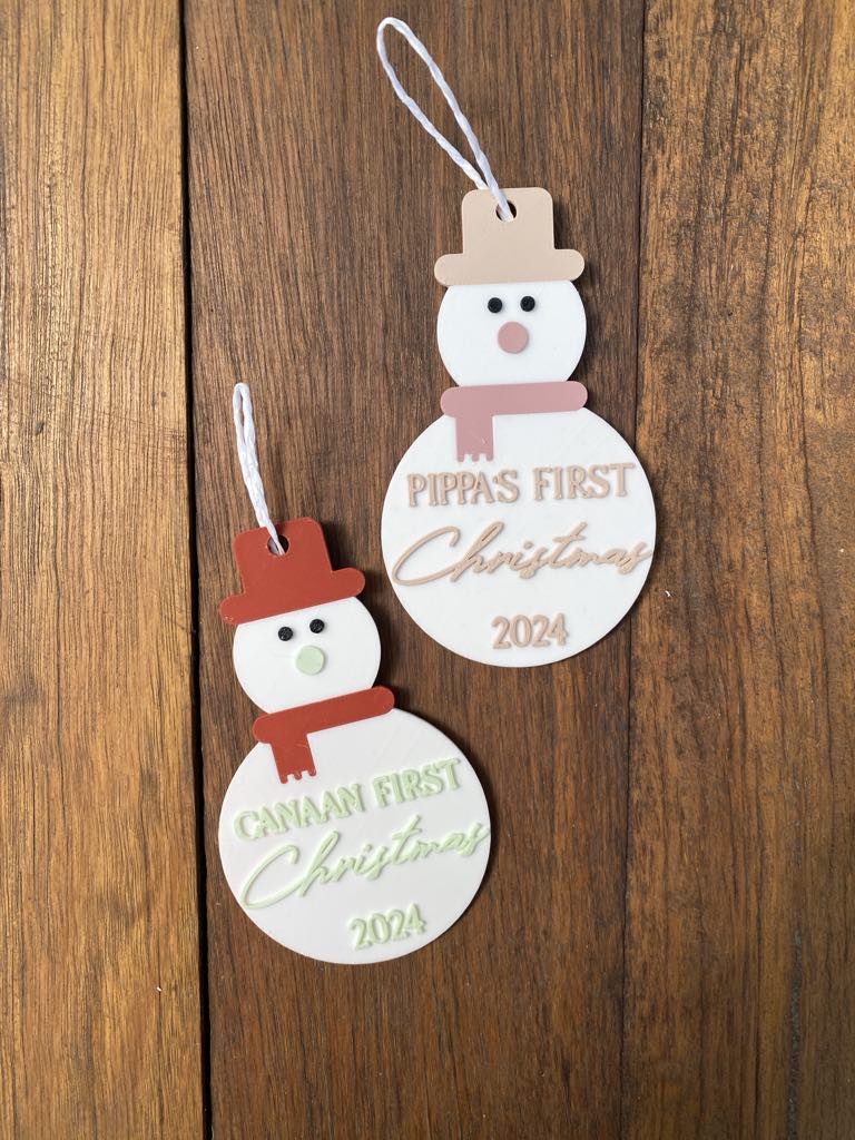 Our ‘Snowman First Christmas Decoration’ is the perfect personalised addition to your Christmas tree this year! A great way for mothers, fathers and family’s to remember their little one’s first Christmas. Our Snowman First Christmas Decorations allows you to add your baby’s name and the choice to add a festive colours of your choice! Available in two sizes.